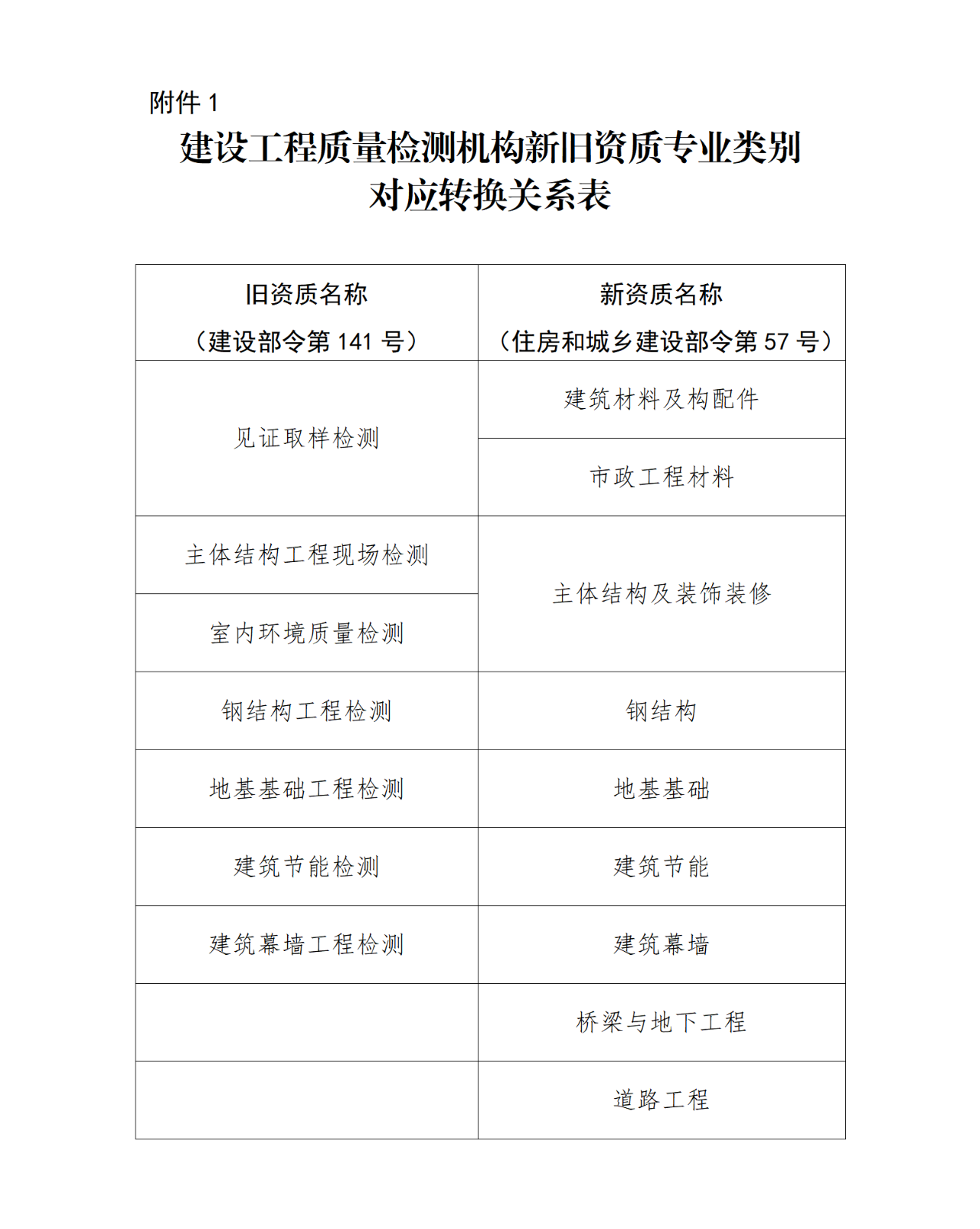 新舊資質(zhì)標(biāo)準(zhǔn)的專業(yè)類別對(duì)應(yīng)轉(zhuǎn)換關(guān)系見附件1。見證取樣檢測(cè)資質(zhì)可以同時(shí)申請(qǐng)建筑材料及構(gòu)配件、市政工程材料檢測(cè)專項(xiàng)資質(zhì)或其中一項(xiàng);具備主體結(jié)構(gòu)工程現(xiàn)場(chǎng)檢測(cè)、室內(nèi)環(huán)境檢測(cè)資質(zhì)的均可申請(qǐng)主體結(jié)構(gòu)和裝飾裝修檢測(cè)專項(xiàng)資質(zhì)。橋梁與地下工程、道路工程檢測(cè)專項(xiàng)資質(zhì)不在本次重新核定范圍。